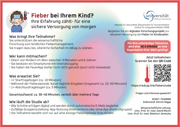 Diese Untersuchung ist als randomisierte kontrollierte Studie (RCT) angelegt. Wir möchten besser verstehen, wie Eltern fiebrige Erkrankungen ihrer Kinder wahrnehmen und ob digitale Hilfsmittel wie die FeverApp Eltern dabei unterstützen können: